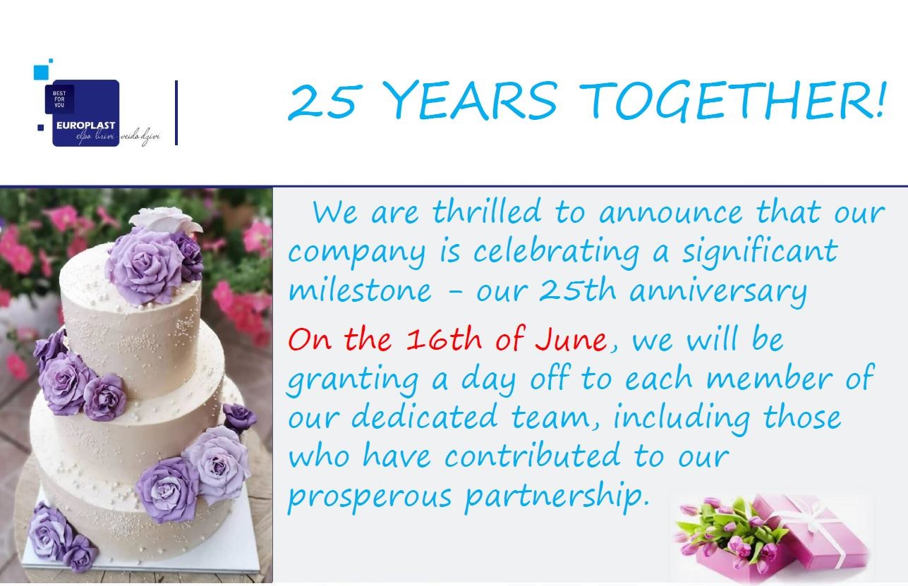 In connection with the 25th birthday of the company, please be informed that on 16.06.2023, the employees of the company will have a holiday.